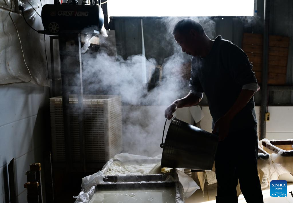 Hu Xuebing, a provincial intangible cultural heritage representative inheritor of the traditional tofu making skills, makes tofu at Daquan Village of Bagongshan Township in Shouxian County, Huainan City, east China's Anhui Province, Apirl 8, 2025. (Xinhua/Zhou Mu)