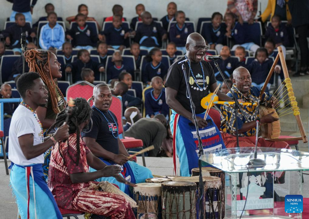 A Kenyan artist performs African music during a cultural event at Kenyatta University in Nairobi, Kenya, on June 18, 2025. (Xinhua/Li Yahui)