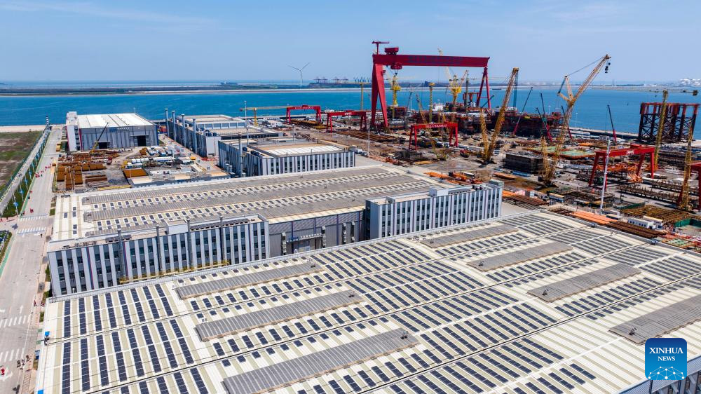 An aerial drone photo taken on June 20, 2025 shows a view of Tianjin intelligent manufacturing base of Offshore Oil Engineering Co., Ltd. in north China's Tianjin. As a national manufacturing R&D base, Tianjin has been making efforts in recent years to make leading enterprises play a role in improving and upgrading of the marine equipment industry. Relevant enterprises have realized transformation towards high-end, intelligent and greening development through upgrading their automated equipment and renovating their intelligent workshops. (Xinhua/Zhao Zishuo)