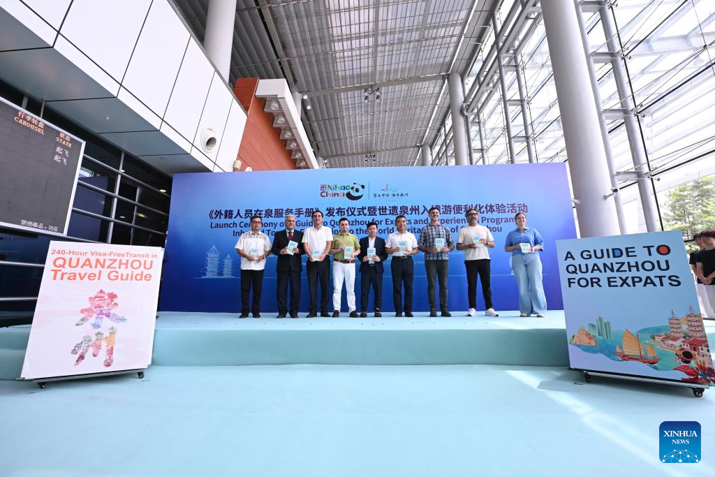 Foreign guests receive two brochures for expats and transit tourists in Quanzhou City at Quanzhou Jinjiang International Airport in Quanzhou, southeast China's Fujian Province, on June 20, 2025. Quanzhou City on Friday issued a guide to Quanzhou for expats and a travel guide for 240-hour visa-free transit in the city.