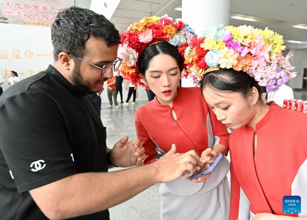 A foreign tourist (C) takes a photo with artists of Quanzhou Nanyin at the West Street scenic spot in Quanzhou, southeast China's Fujian Province, on June 20, 2025. Quanzhou City on Friday issued a guide to Quanzhou for expats and a travel guide for 240-hour visa-free transit in the city.