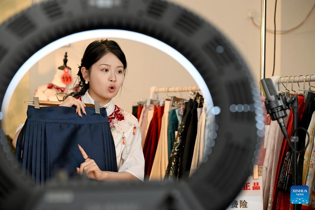 A staff member promotes Hanfu via livestreaming at a Hanfu base in Caoxian County, east China's Shandong Province, June 17, 2025. (Xinhua/Shao Zedong)
