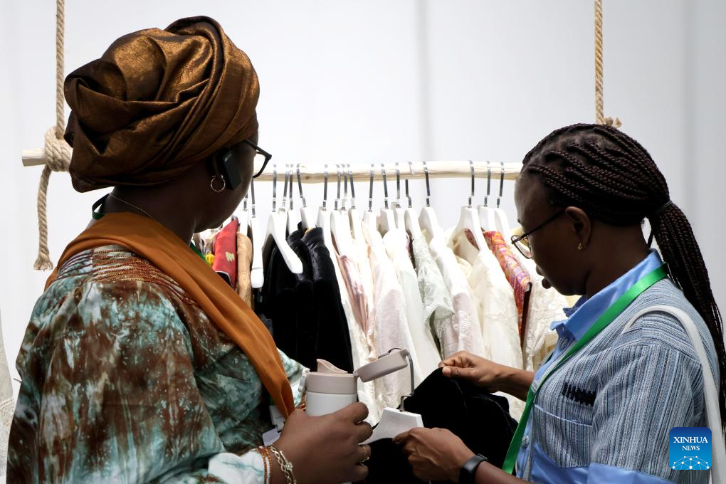 A participant of a training course hosted by China Woman's University views Hanfu at a digital economy industrial park in Caoxian County, east China's Shandong Province, June 19, 2025. (Xinhua/Guo Xulei)