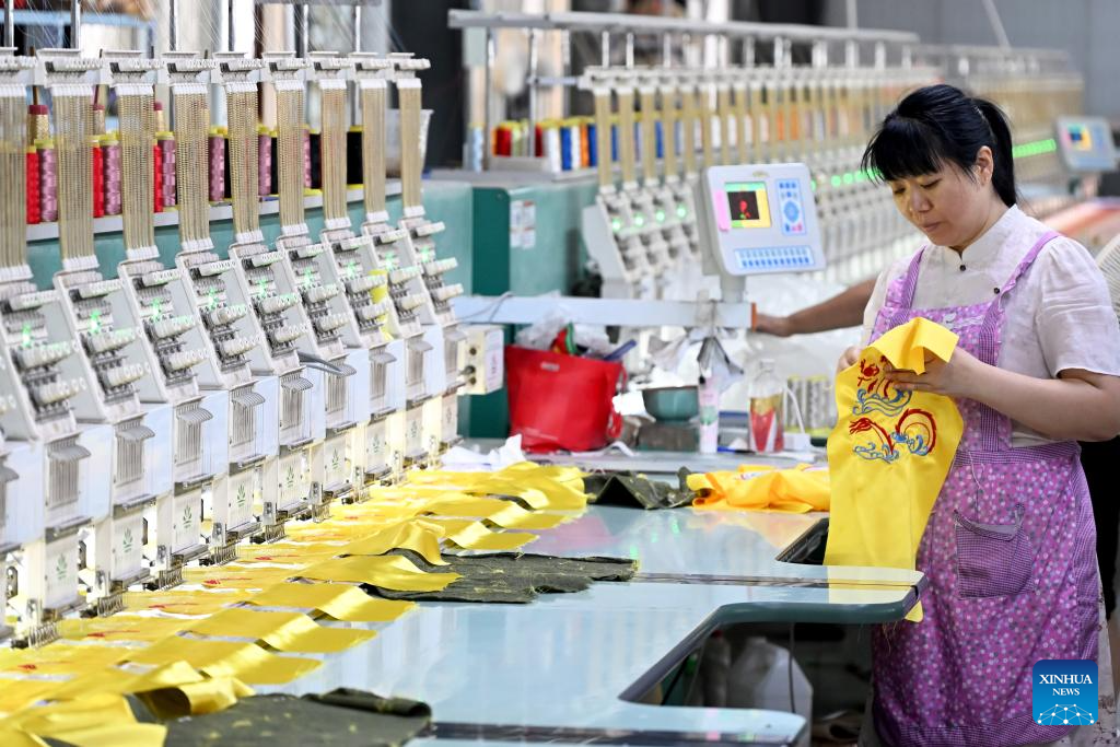 A staff member monitors the work of embroidery machines in an embroidery enterprise in Caoxian County, east China's Shandong Province, June 19, 2025. (Xinhua/Guo Xulei)