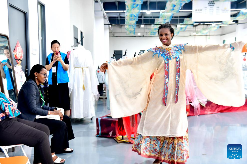 A participant of a training course hosted by China Woman's University tries on Hanfu attire at a Hanfu base in Caoxian County, east China's Shandong Province, June 19, 2025. (Xinhua/Guo Xulei)