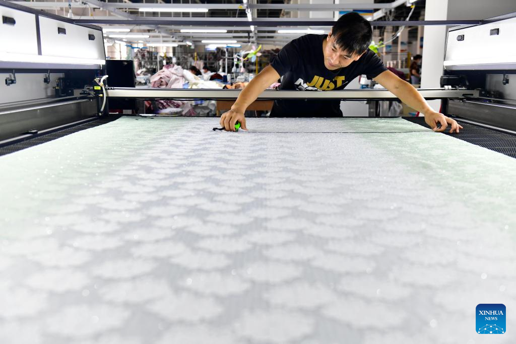 A staff member works on a piece of horse-face skirt, or Mamianqun, at a technology industrial park in Caoxian County, east China's Shandong Province, June 17, 2025. (Xinhua/Sui Shangjun)