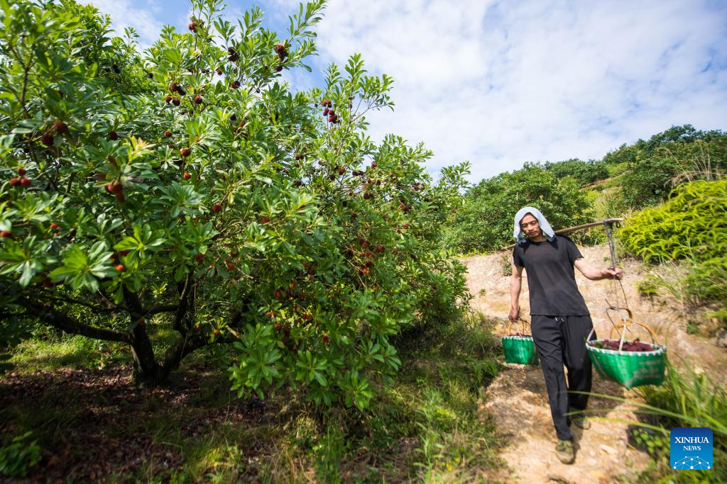 A farmer picks Dongkui waxberries at an orchard in Wencheng County, east China's Zhejiang Province, June 23, 2025.