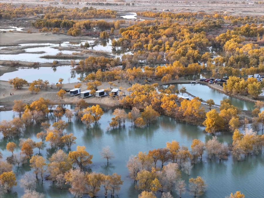 An aerial drone photo taken on Oct. 25, 2024 shows the autumn scenery of the desert poplar forest at the Huludao (Gourd Island) scenic spot in Yuli County, northwest China's Xinjiang Uygur Autonomous Region. (Xinhua/Hu Huhu)
