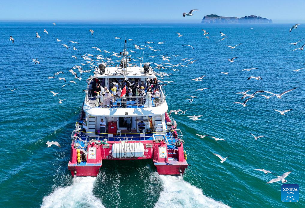 A drone photo taken on June 23, 2025 shows tourists enjoying a boat tour in Rongcheng City, east China's Shandong Province. (Photo by Li Xinjun/Xinhua)