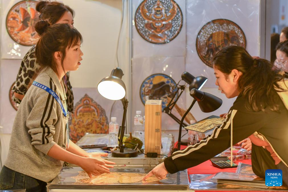 Visitors select products during the 9th China-South Asia Expo in Kunming, southwest China's Yunnan Province, June 24, 2025. The 9th China-South Asia Expo came to an end on Tuesday. A total of 153 agreements have been signed as of 12: 00 on June 24, with the total value of foreign trade contracts reaching 8.479 billion yuan (about 1.18 billion U.S. dollars). (Photo by Peng Yikai/Xinhua)