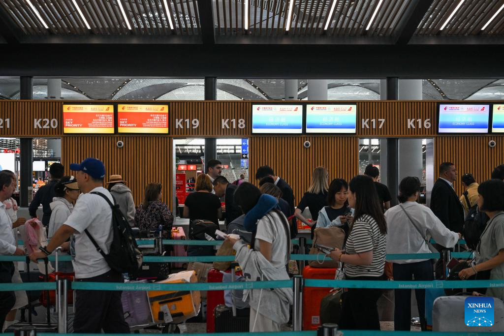 Passengers line up at the China Eastern Airlines check-in counters to board the first direct flight from Istanbul to Xi'an at Istanbul Airport in Türkiye, on June 24, 2025. A China Eastern Airlines flight carrying over 200 passengers touched down at Istanbul Airport at around 7 a.m. local time (0400 GMT) on Tuesday, marking the launch of the airline's new direct route between Xi'an in southwestern China and Trkiye's Istanbul. (Xinhua/Liu Lei)
