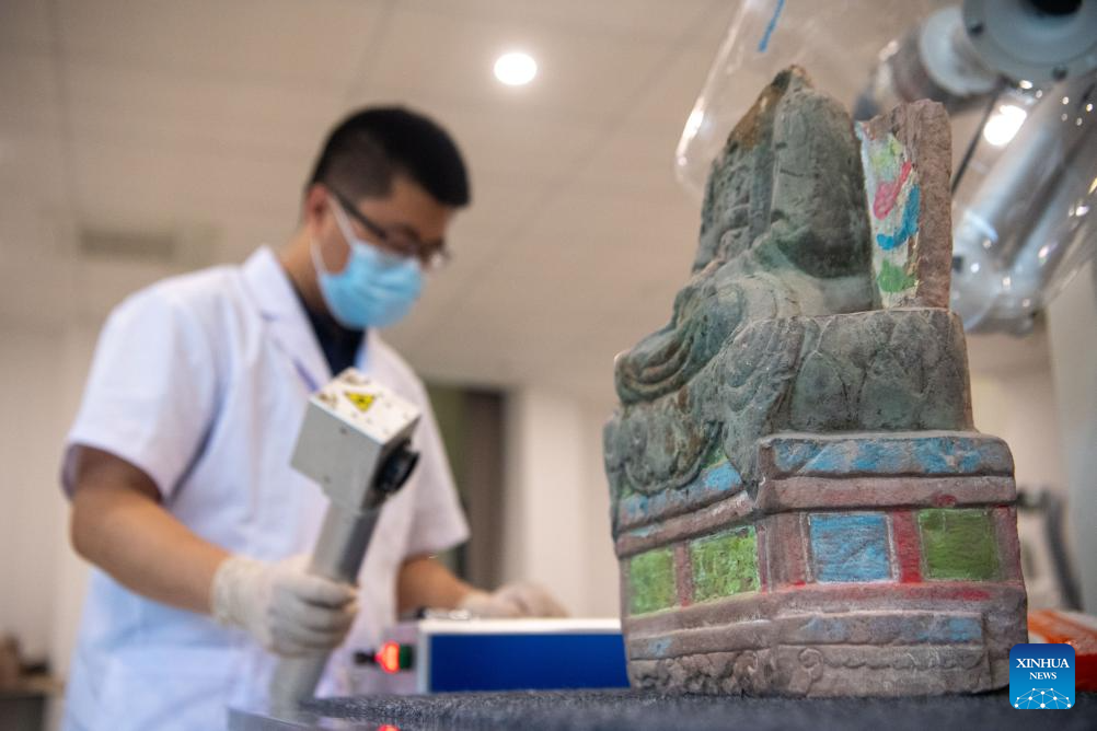 A staff member restores a rock-made relic at the Dazu Rock Carvings studio for relics restoration in southwest China's Chongqing Municipality, June 24, 2025. Dazu Rock Carvings, a UNESCO World Heritage Site in southwest China's Chongqing Municipality, is being injected with new vigor as various digital technologies are used for its protection and utilization.