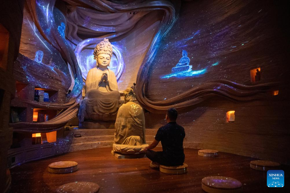 A tourist experiences a digital audio-visual scenario at the Dazu Rock Carvings scenic spot in southwest China's Chongqing Municipality, June 24, 2025. Dazu Rock Carvings, a UNESCO World Heritage Site in southwest China's Chongqing Municipality, is being injected with new vigor as various digital technologies are used for its protection and utilization.