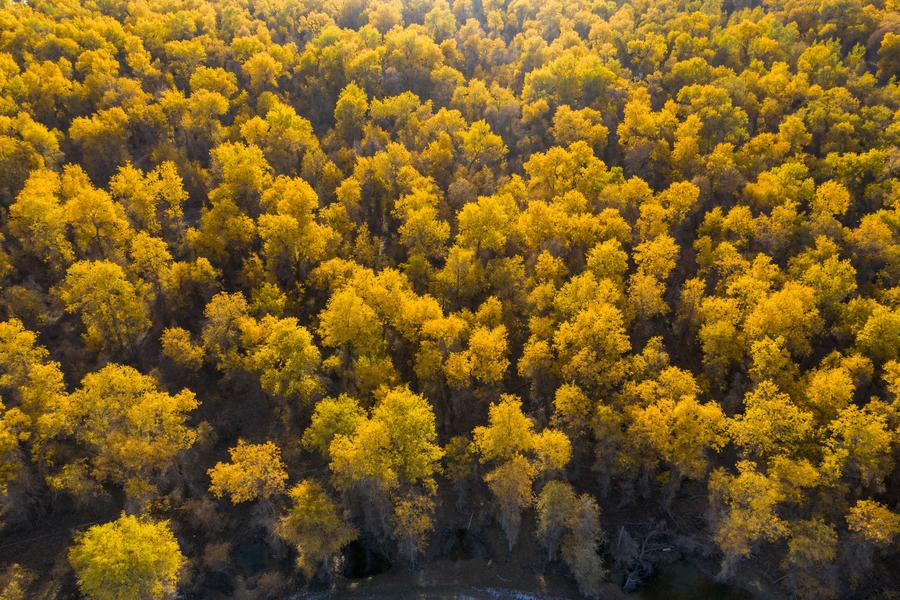 Aerial photo taken on Oct. 22, 2020 shows the autumn scenery of desert poplar (populus euphratica) forest along the Tarim River in Xayar County, northwest China's Xinjiang Uygur Autonomous Region. (Xinhua/Hu Huhu)