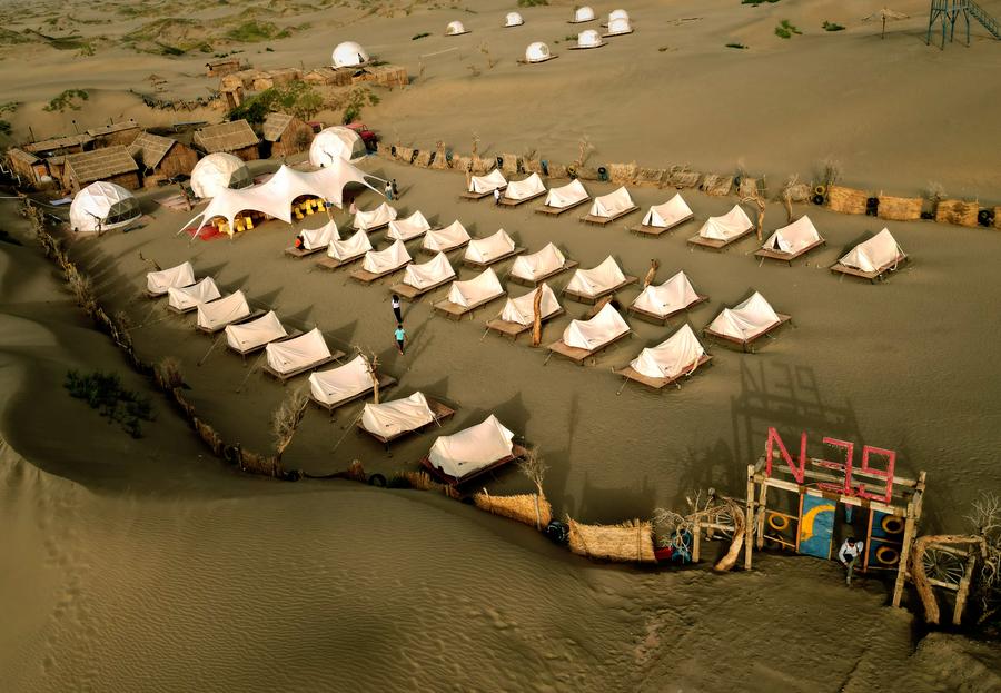 This aerial photo taken on Sept. 7, 2023 shows a campsite at a desert scenic spot in Makit County of Kashgar, northwest China's Xinjiang Uygur Autonomous Region. (Xinhua/Li An)