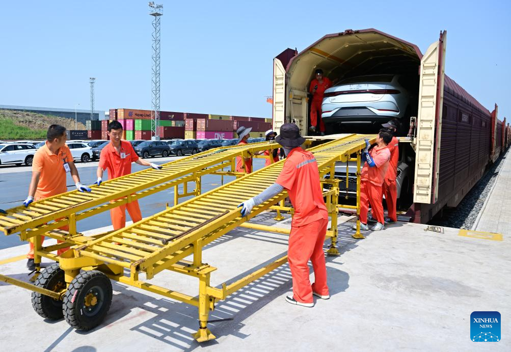 Staff members load cars for export into a carriage of a special-purpose train at the Paihe Port railway logistics base in Hefei, east China's Anhui Province, June 17, 2025. Anhui Province takes advantage of convenient transportation infrastructure such as railway freight stations and ports along the Yangtze River to vigorously promote logistics development and local consumption. (Xinhua/Zhou Mu)
