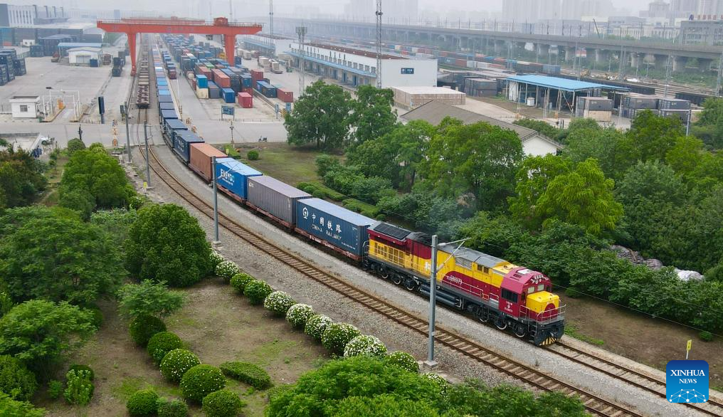 This photo shows a China-Europe freight train departing from a logistics center of Hefei north railway station in Hefei, east China's Anhui Province, June 13, 2025. Anhui Province takes advantage of convenient transportation infrastructure such as railway freight stations and ports along the Yangtze River to vigorously promote logistics development and local consumption. (Xinhua/Zhou Mu)