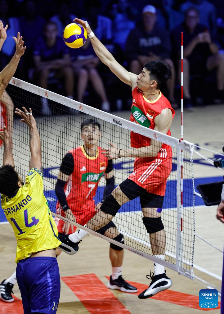 Li Yongzhen (top R) of China spikes the ball during the Pool 5 match between China and Brazil at the Men's Volleyball Nations League (VNL) 2025 in Chicago, the United States, June 26, 2025. (Photo by Joel Lerner/Xinhua)