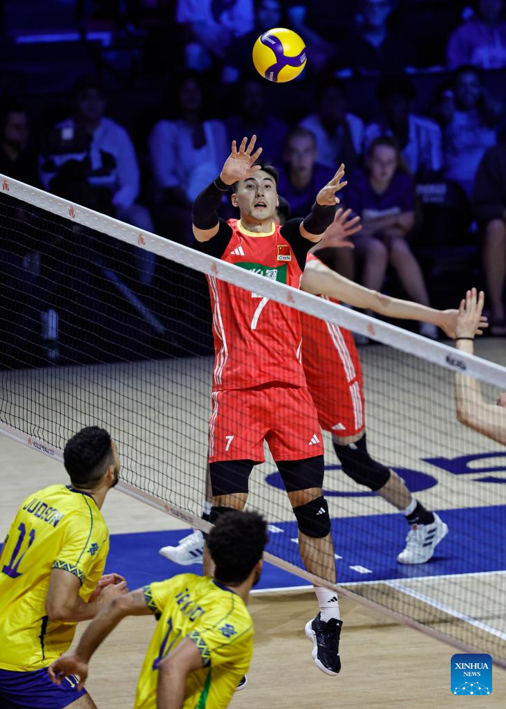 Wang Hebin (R) of China sets the ball during the Pool 5 match between China and Brazil at the Men's Volleyball Nations League (VNL) 2025 in Chicago, the United States, June 26, 2025. (Photo by Joel Lerner/Xinhua)