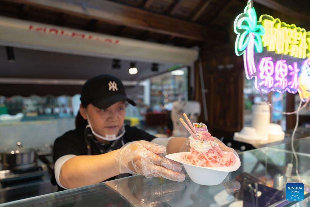 Wang Yan shows a serving of shaved ice at the Taipei Street in Kunming, southwest China's Yunnan Province, June 6, 2025. (Xinhua/Gao Yongwei)