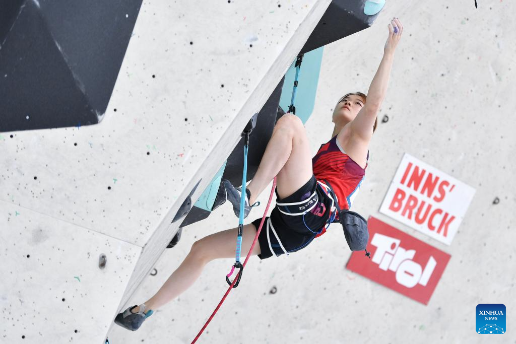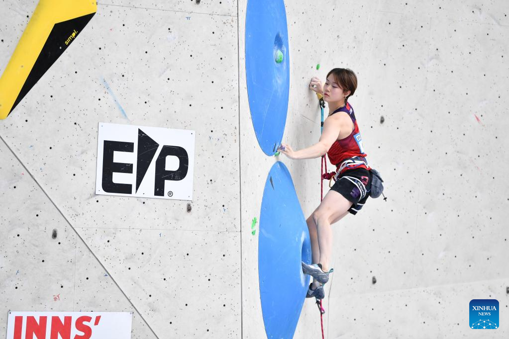 Luo Zhilu of China competes during the women's lead qualification at the International Federation of Sport Climbing (IFSC) World Cup in Innsbruck, Austria, June 28, 2025. (Xinhua/Lian Yi)