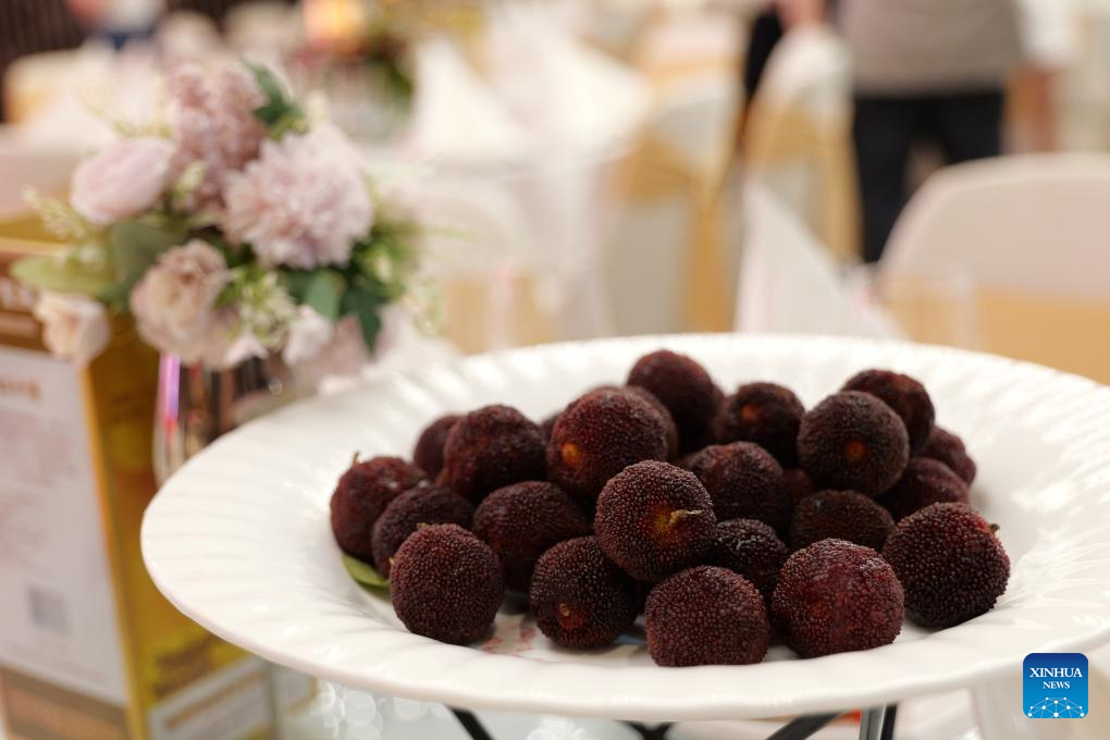 Dongkui waxberries are pictured at a restaurant in Frankfurt, Germany, June 24, 2025. (Xinhua/Tai Sicong)