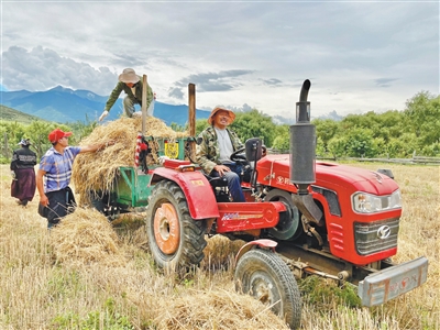 Villagers gather wheat straw in Kala village, Nyingchi town, Bayi district of Nyingchi city, southwest China's Xizang Autonomous Region. (Photo/Huang Haifen)