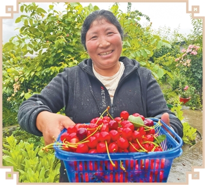A villager shows freshly picked cherries in Kala village, Nyingchi town, Bayi district of Nyingchi city, southwest China's Xizang Autonomous Region. (Photo/Huang Haifen)