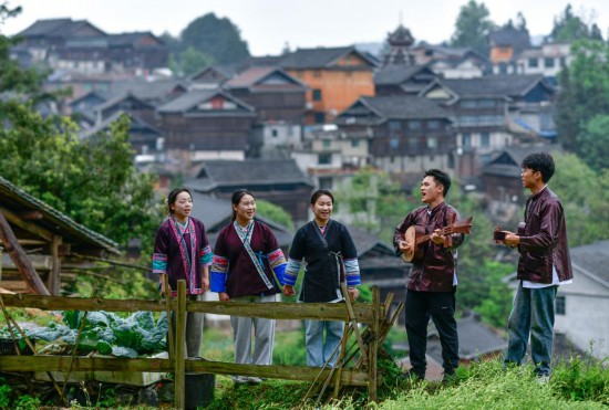 Yang Xiangni (3rd L) and her team members practice a song of the Dong ethnic group in Zhaoxing Town of Liping County, southwest China's Guizhou Province, April 23, 2025. (Xinhua/Yang Wenbin)