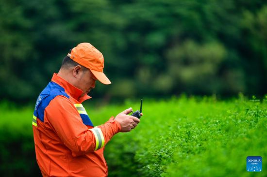 A forest ranger uses a drone to monitor the Changpoling Forest Farm in Guiyang, southwest China's Guizhou Province, July 1, 2025.