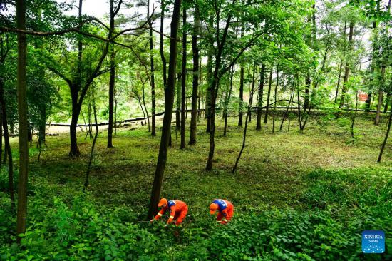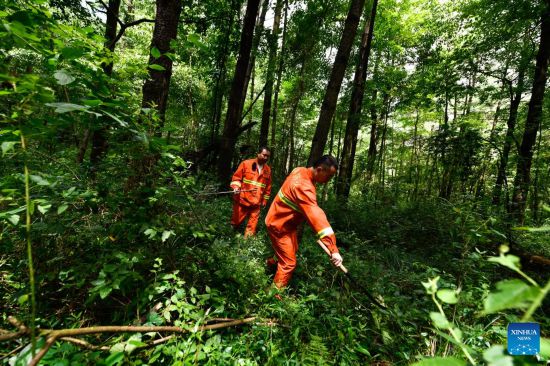 Forest rangers weed at the Changpoling Forest Farm in Guiyang, southwest China's Guizhou Province, July 1, 2025.