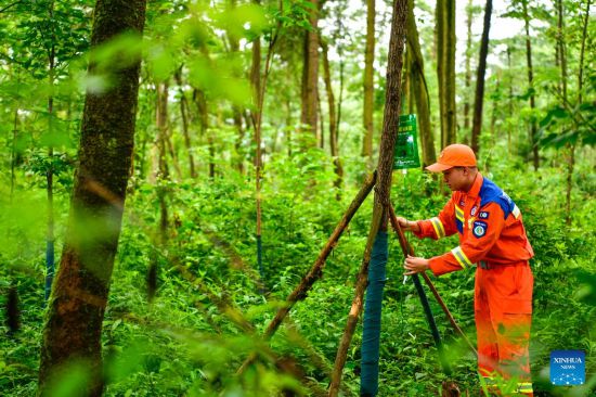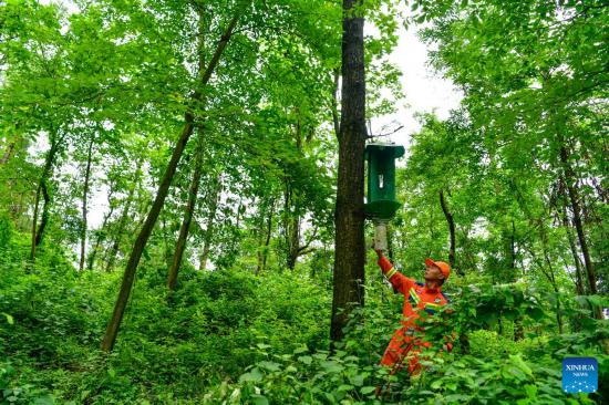 A forest ranger checks the pest control trap at the Changpoling Forest Farm in Guiyang, southwest China's Guizhou Province, July 1, 2025.