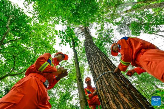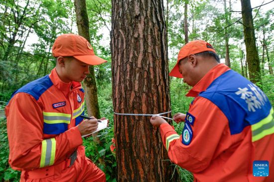 Forest rangers measure the diameter of a tree at the Changpoling Forest Farm in Guiyang, southwest China's Guizhou Province, July 1, 2025.