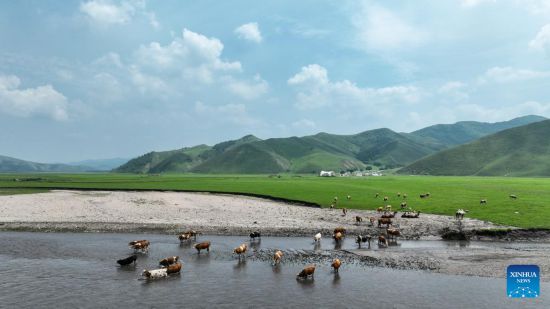 An aerial drone photo taken on July 4, 2025 shows the scenery of the Wulanmaodu pasture in Horqin Right Wing Front Banner, Hinggan League, north China's Inner Mongolia Autonomous Region. In the first half of this year, the banner recorded 2.55 million tourist trips, with total tourism expenditure reaching 882 million yuan (about 123.12 million U.S. dollars). (Xinhua/Bei He)