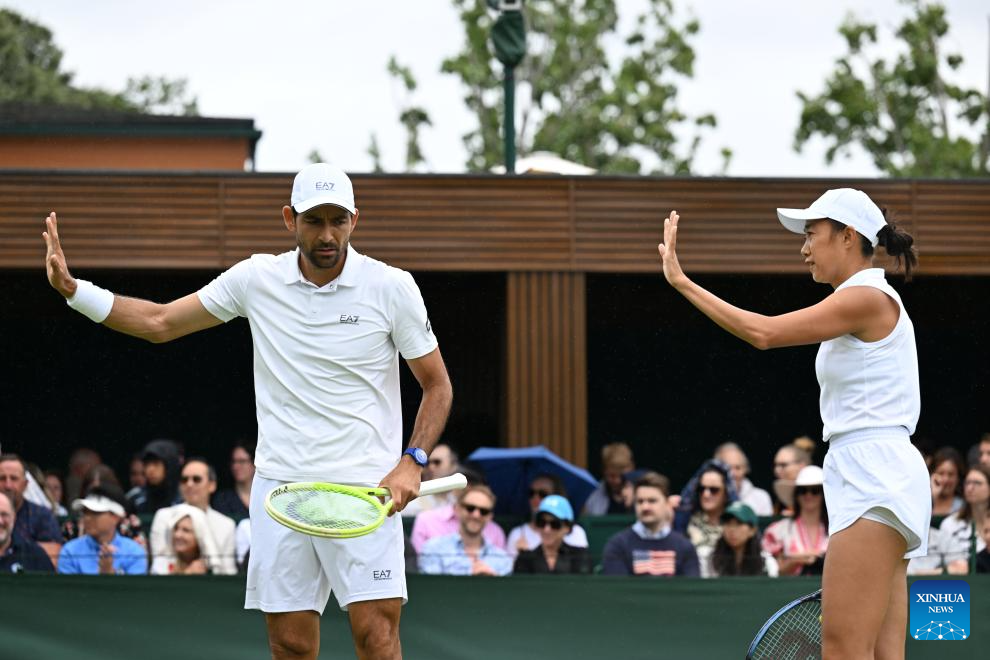 Zhang Shuai (L)/Marcelo Arevalo compete during the mixed doubles first round match between Zhang Shuai of China/Marcelo Arevalo of El Salvador and Chan Hao-Ching of Chinese Taipei/Andre Goransson of Sweden at the Wimbledon Tennis Championships in London, Britain, July 5, 2025. (Xinhua/Zhao Dingzhe)