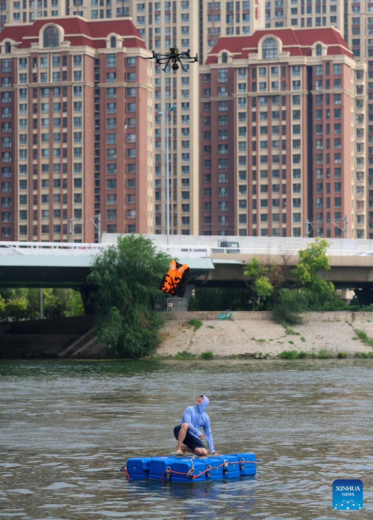 A drone delivers a life jacket during a flood rescue drill on Haihe River in north China's Tianjin, on July 5, 2025. The drill was set against potential flooding in culverts and low-lying urban areas affected by heavy rainfall. (Xinhua/Sun Fanyue)