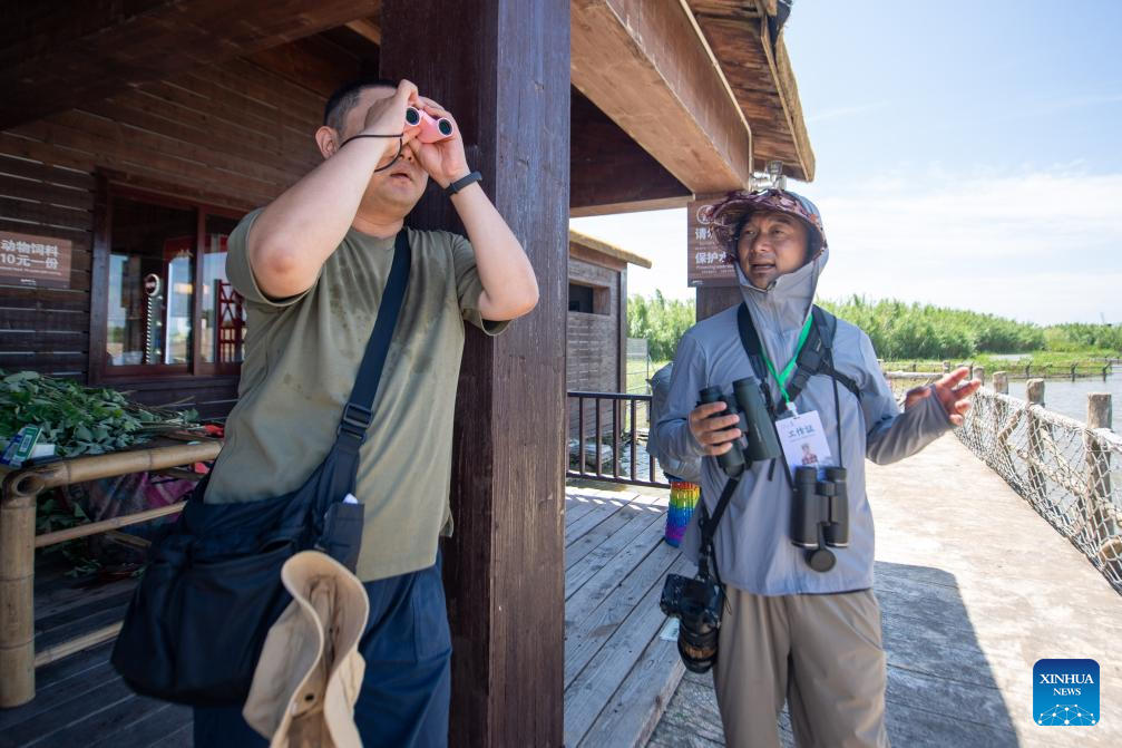 Tourists observe birds at a birdwatching spot at Hangzhou Bay National Wetland Park in Ningbo, east China's Zhejiang Province, July 5, 2025.
