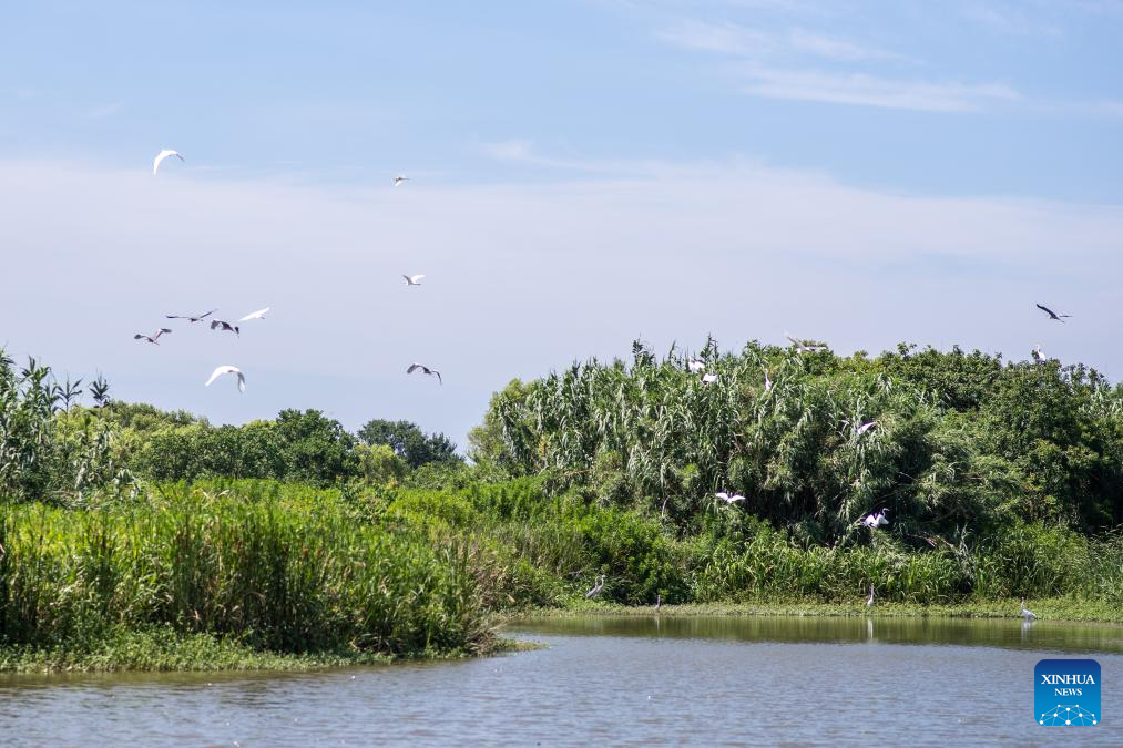 White egrets soar over Hangzhou Bay National Wetland Park in Ningbo, east China's Zhejiang Province, July 5, 2025.