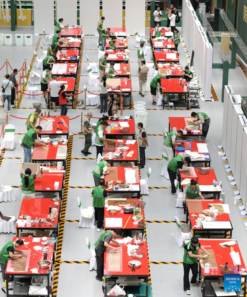Contestants compete in paper calligraphy and painting relic restoration during the 2nd National Cultural Heritage Vocational Skills Competition in Luzhou City, southwest China's Sichuan Province, July 4, 2025. Starting from July 3, the four-day event attracted nearly 300 contestants competing in six categories. (Xinhua/Liu Kun)