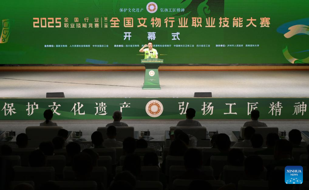 Contestants compete in woodwork relic restoration during the 2nd National Cultural Heritage Vocational Skills Competition in Luzhou City, southwest China's Sichuan Province, July 4, 2025. Starting from July 3, the four-day event attracted nearly 300 contestants competing in six categories. (Xinhua/Li He)