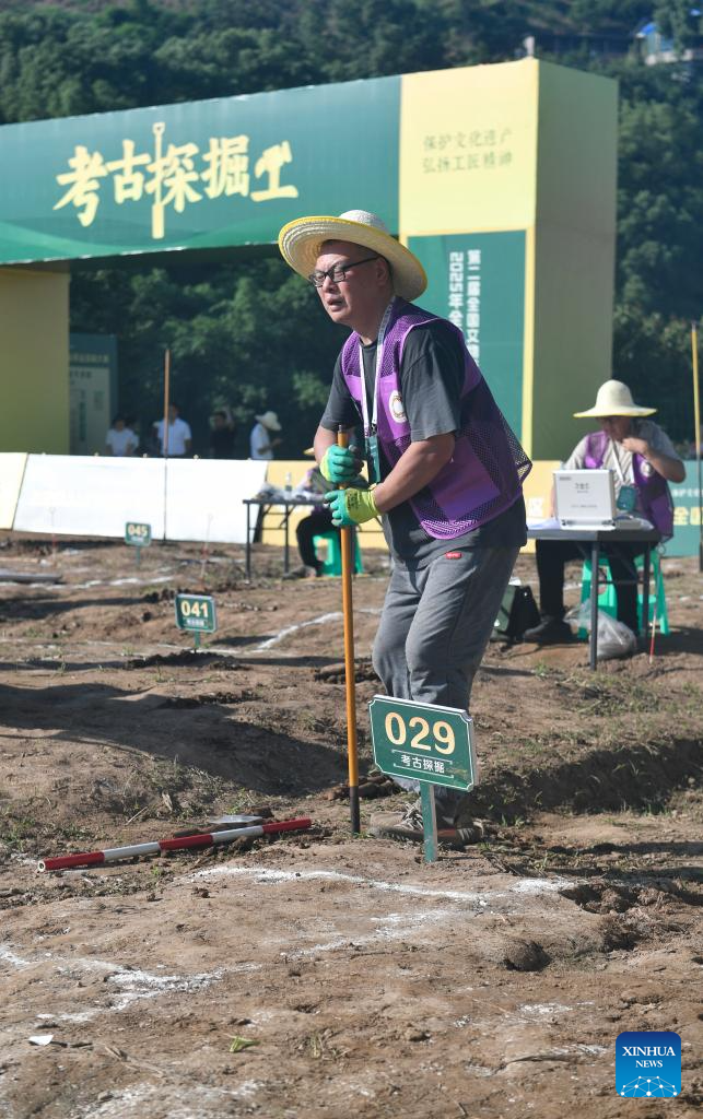 A contestant competes in archaeological excavation during the 2nd National Cultural Heritage Vocational Skills Competition in Luzhou City, southwest China's Sichuan Province, July 4, 2025. Starting from July 3, the four-day event attracted nearly 300 contestants competing in six categories. (Xinhua/Li He)