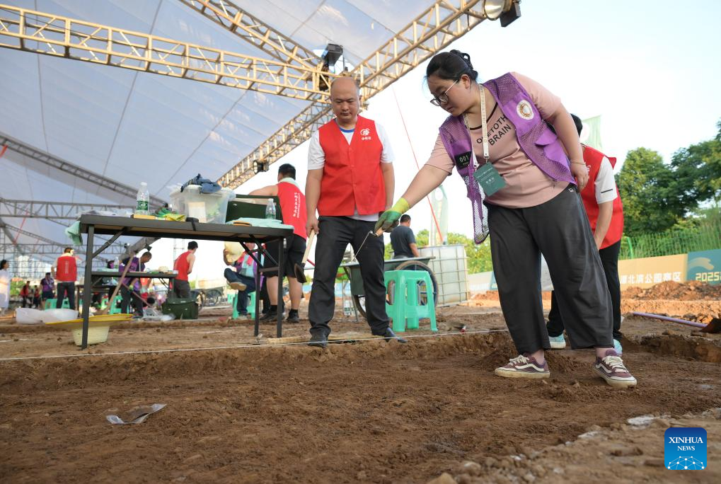 A contestant competes in archaeological excavation during the 2nd National Cultural Heritage Vocational Skills Competition in Luzhou City, southwest China's Sichuan Province, July 4, 2025. Starting from July 3, the four-day event attracted nearly 300 contestants competing in six categories. (Xinhua/Liu Kun)