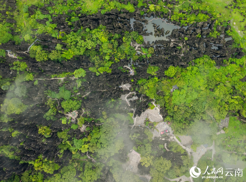 Photo shows an aerial view of the Stone Forest Scenic Area in Kunming, southwest China's Yunnan Province, in the rain. (People's Daily Online/Yin Xin)