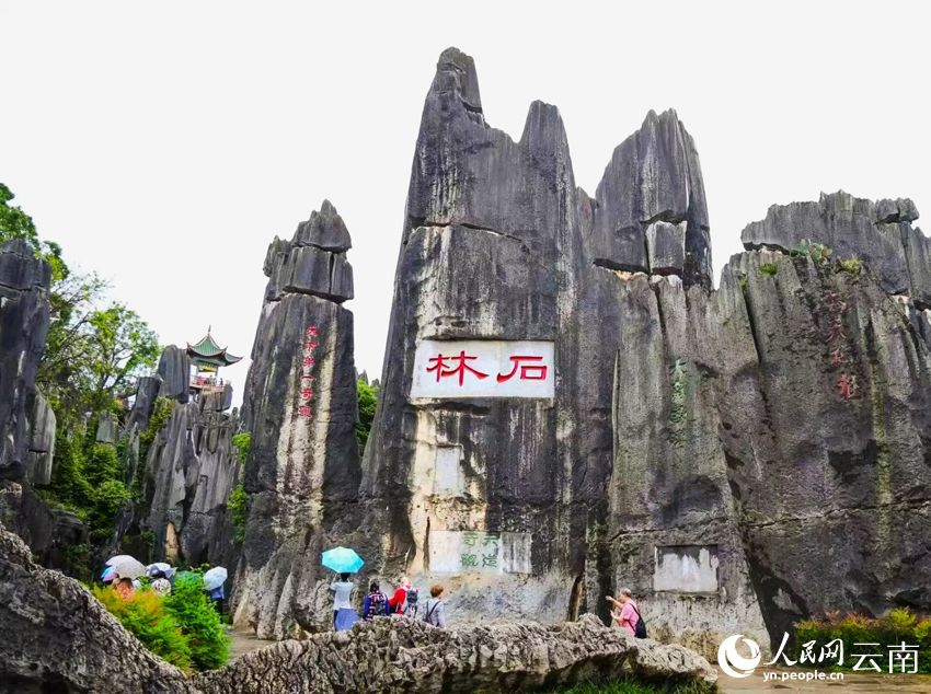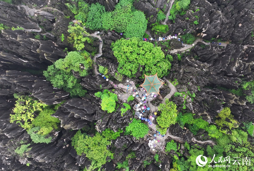 Photo shows tourists strolling under umbrellas in the Stone Forest Scenic Area in Kunming, southwest China's Yunnan Province. (People's Daily Online/Yin Xin)