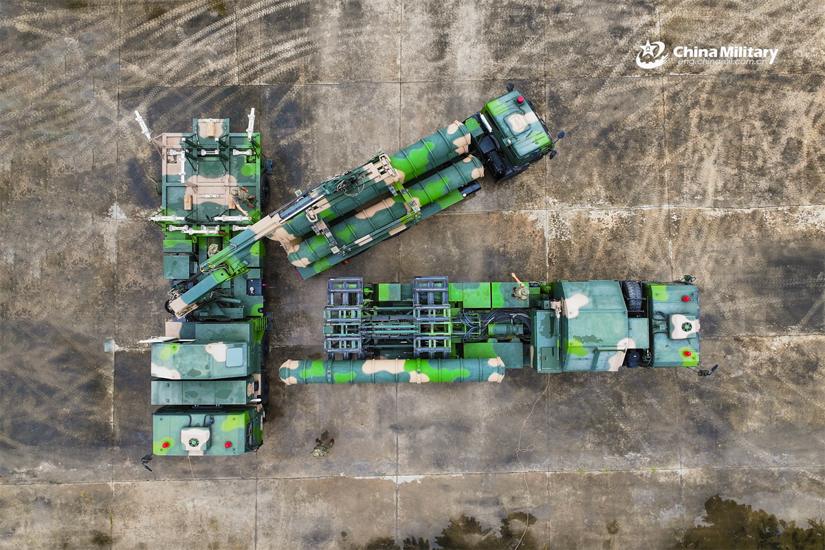 Soldiers assigned to a surface-to-air missile unit with the air force under the Chinese PLA Eastern Theater Command hoist and load surface-to-air missile onto a missile launching truck during a comprehensive training exercise in late June, 2025. (eng.chinamil.com.cn/Photo by Liang Hongwei)