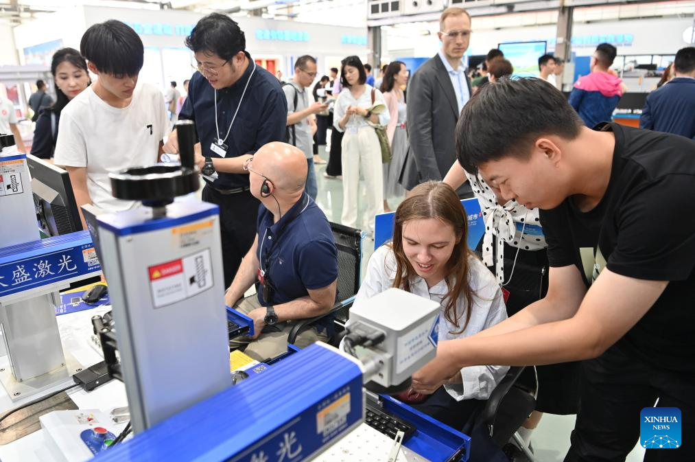 Guests communicate at Tianjin Light Industry Vocational Technical College in north China's Tianjin, July 7, 2025. Guests gathered in Tianjin for the Global Mayors Dialogue -- SCO Summit Cities and visited the smart zero-carbon terminal of Tianjin Port, Luban Workshop Construction and Experience Museum and other places to learn about China's economic and social development. (Xinhua/Li Ran)