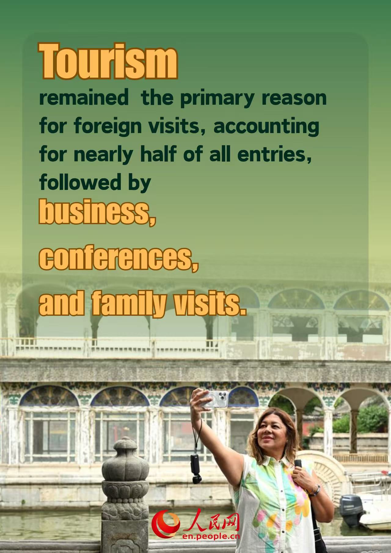 Tourism remained the primary reason for foreign visits, accounting for nearly half of all entries, followed by business, conferences, and family visits.