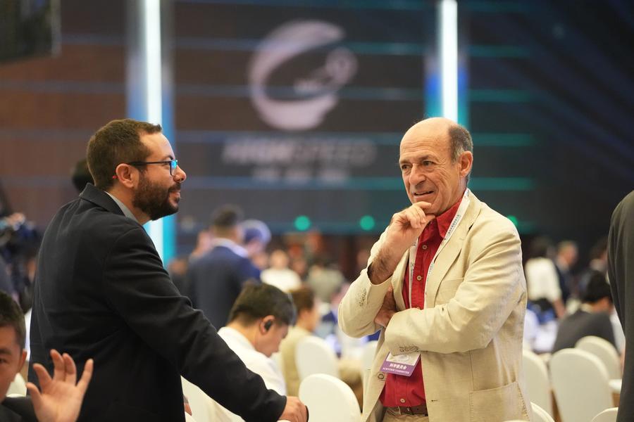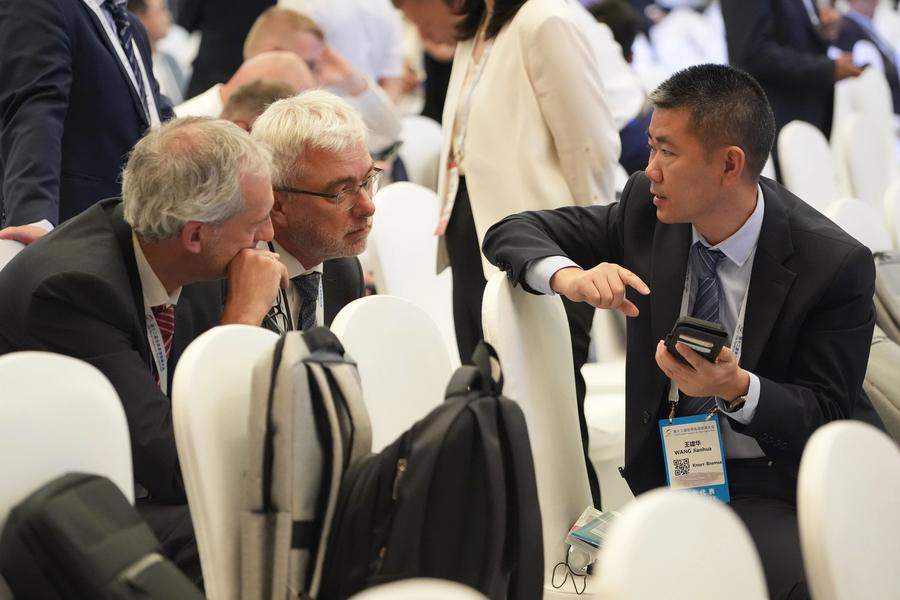 Guests communicate during the 12th World Congress on High-Speed Rail in Beijing, capital of China, July 8, 2025. (Xinhua/Xing Guangli)