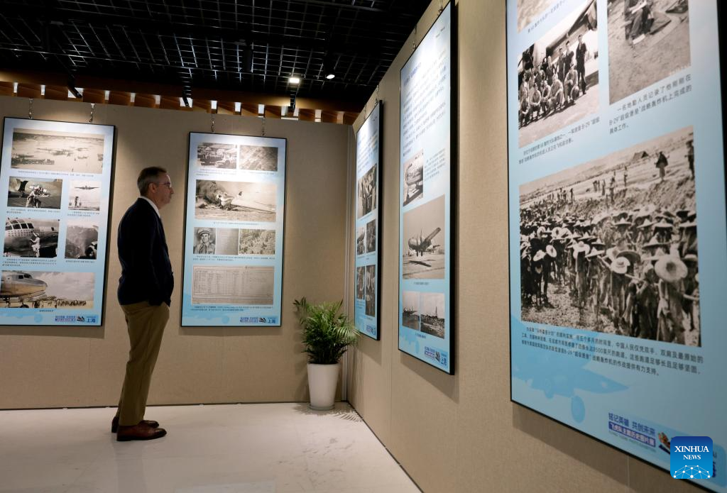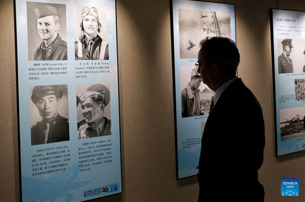 A visitor views exhibits at the Flying Tigers Photo Exhibition in Shanghai, east China, July 8, 2025. Themed "Remembering heroes and creating the future together," the exhibition opened here on Tuesday, showcasing hundreds of valuable photos as well as other items of historic significance contributed by veterans of the Flying Tigers. (Xinhua/Fang Zhe)