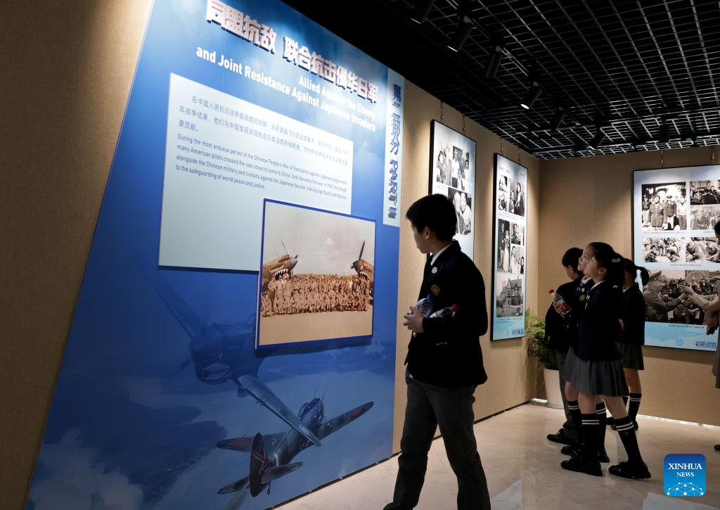 Children view exhibits at the Flying Tigers Photo Exhibition in Shanghai, east China, July 8, 2025. Themed "Remembering heroes and creating the future together," the exhibition opened here on Tuesday, showcasing hundreds of valuable photos as well as other items of historic significance contributed by veterans of the Flying Tigers. (Xinhua/Fang Zhe)